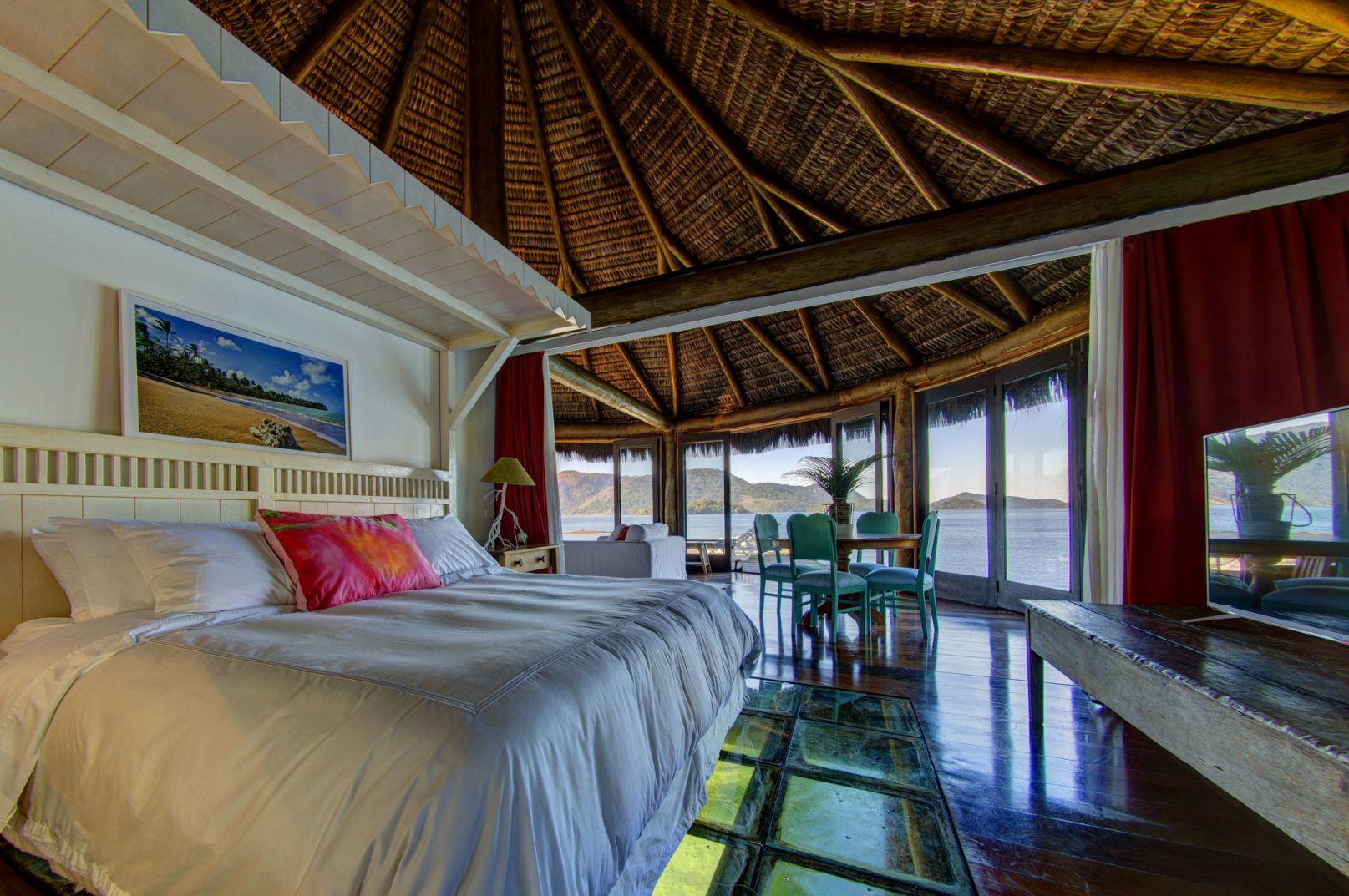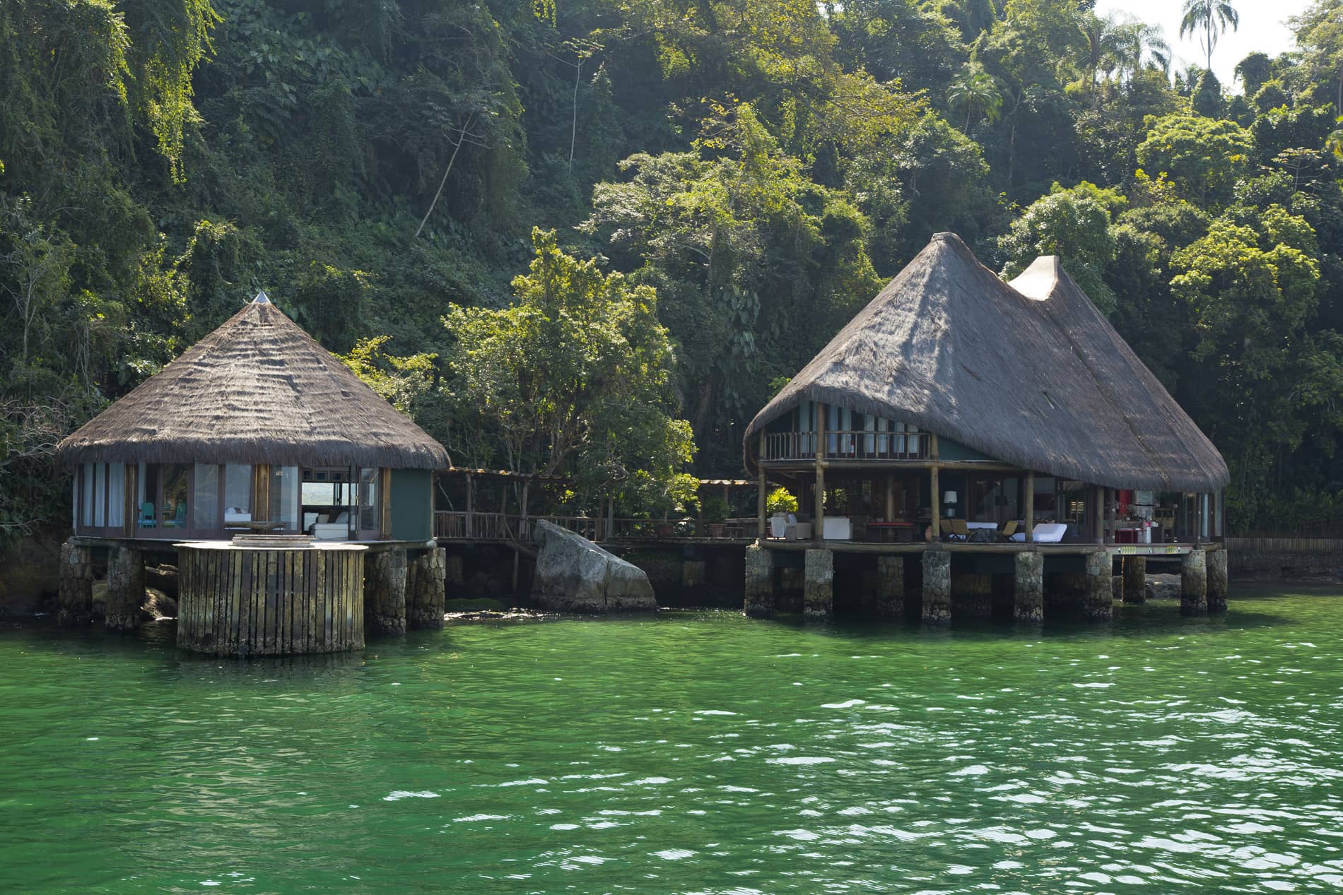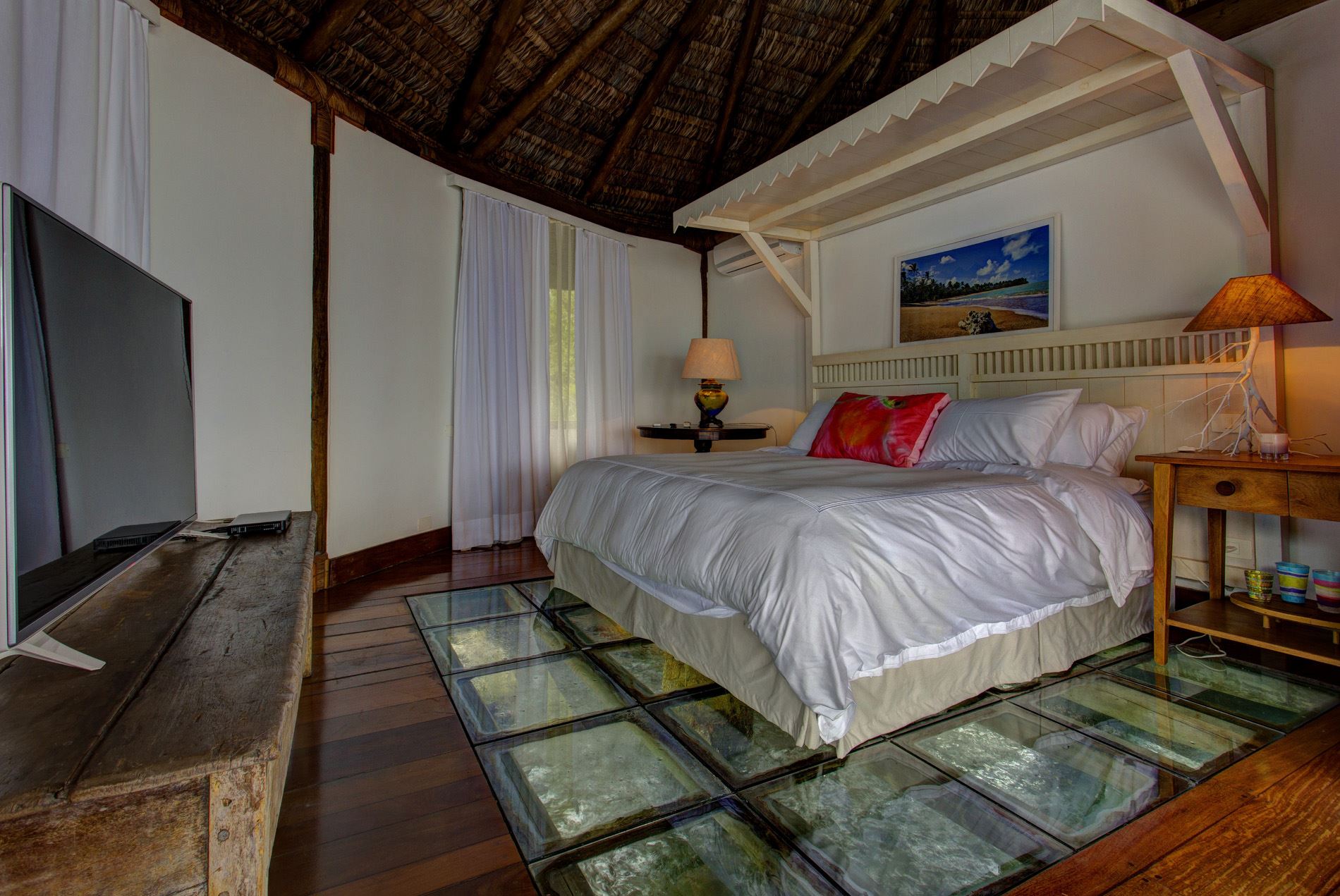 Com arquitetura rústica porém extremamente confortável, a casa é construída sobre palafitas e abusa dos vidros, fazendo com que o mar transparente e a Mata Atlântica virgem, sejam os protagonistas do cenário e possam ser apreciados de todos os cômodos da casa.