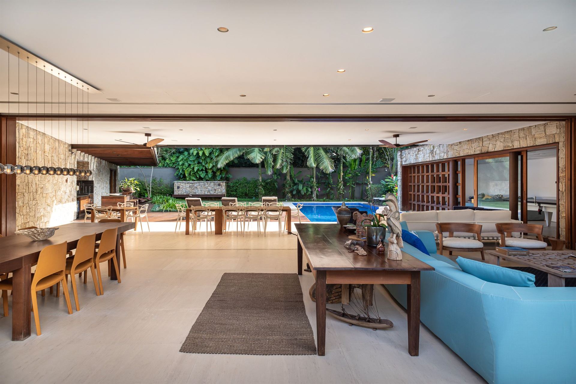 Moderno e funcional, o projeto de Gui Mattos aposta em ambientes totalmente integrados e voltados para uma deliciosa piscina com jardim. O verde, inclusive, é o contraste perfeito para o uso da madeira, do vidro e da pedra usados na construção.