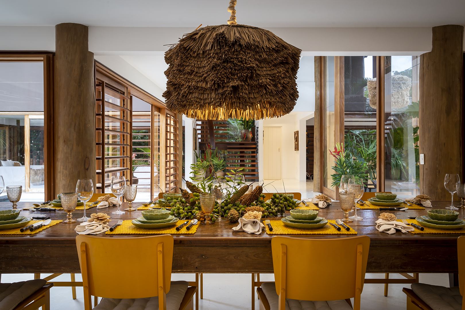 Ideal para reunir turmas de amigos, a propriedade tem 7 suítes, sendo que 3 delas ficam em bangalôs independentes para quem prefere privacidade total, além de uma ampla sala de estar e outra de televisão.