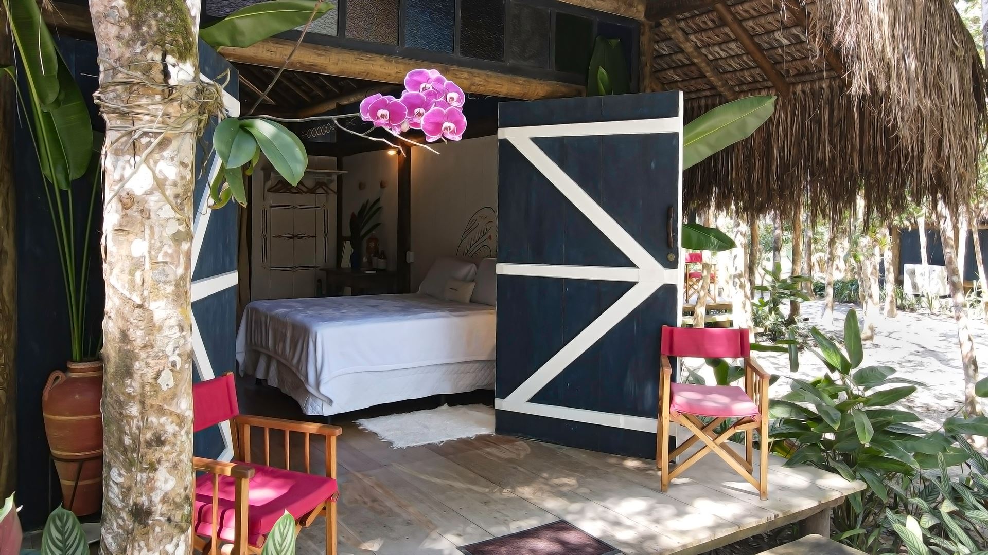 Na hora de descansar, basta seguir para os bangalôs menores – são cinco, cada um com uma suíte – e aproveitar a brisa baiana. Em tempo: há uma suíte master no segundo andar do bloco principal, com vista para a copa das árvores.